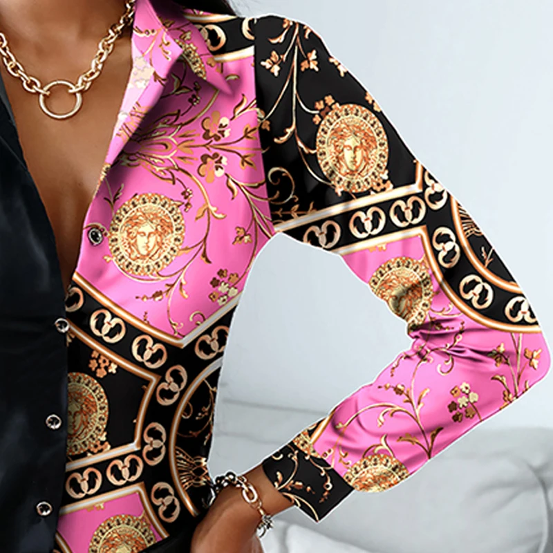 2021 Autumn Casual Women T Shirts Turn-down Collar Long Sleeve Blouse Scarf Print Colorblock Patchwork Button-up Top