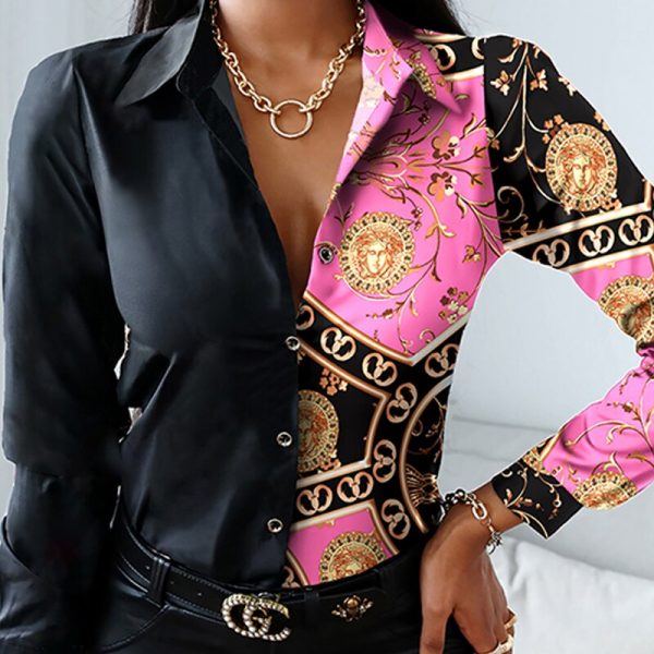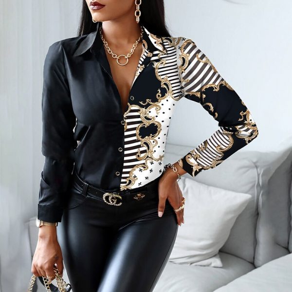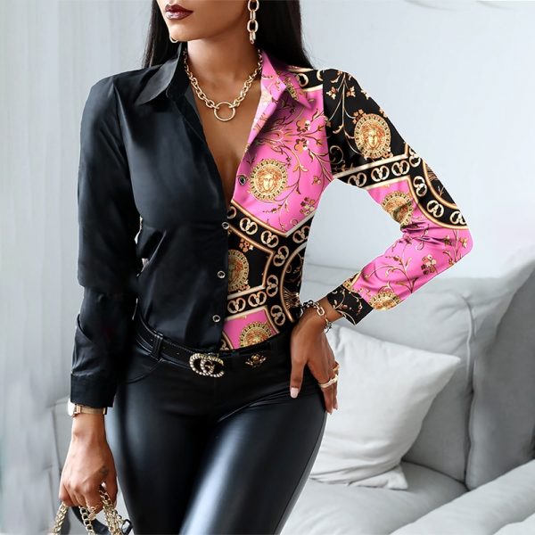 2021 Autumn Casual Women T Shirts Turn-down Collar Long Sleeve Blouse Scarf Print Colorblock Patchwork Button-up Top