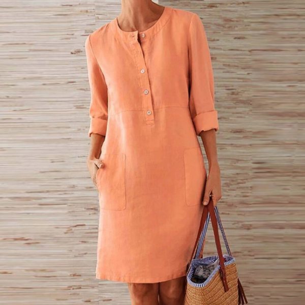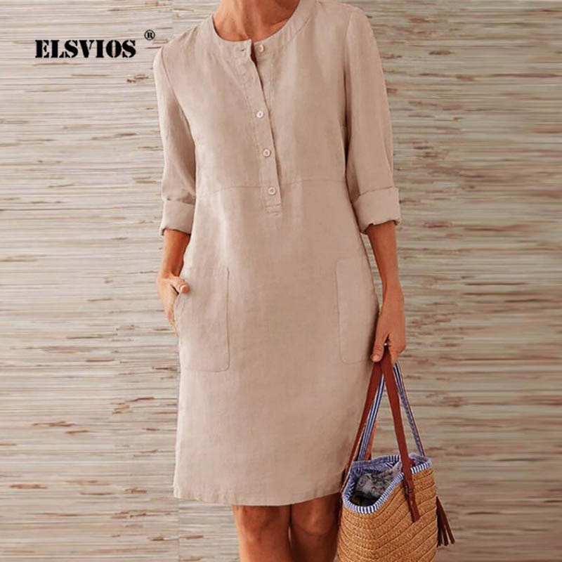 ELSVIOS 2020 Winter Autumn Button Cotton Linen Dress women Elegant O-Neck Knee length Long Sleeve Pocket Solid Dress Plus Size