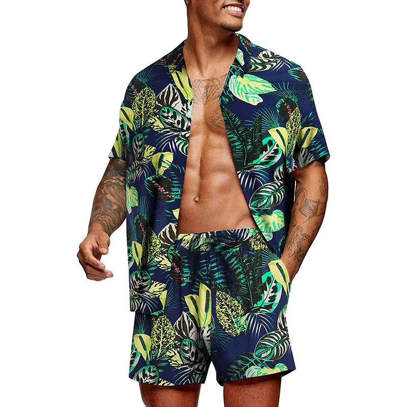 New Trend Men Hawaiian Sets Summer Feather Printing Short Sleeve Button Shirt Beach Shorts Two Set Casual Trip Mens 2 Piece Suit